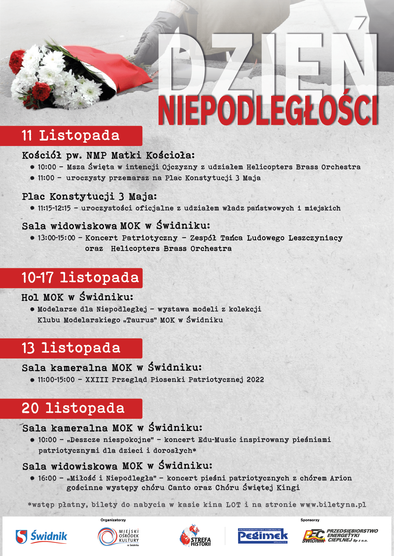 11 listopada to ważny dzień w kartach naszej historii. Tego dnia, w 1918 roku, po 123 latach zaborów, Polska odzyskała wolność i wróciła na mapy świata. Z okazji Narodowego Święta Niepodległości w naszym mieście odbędzie się wiele wydarzeń, a wśród nich znalazły się oficjalne uroczystości, koncerty, wystawy i imprezy sportowe.