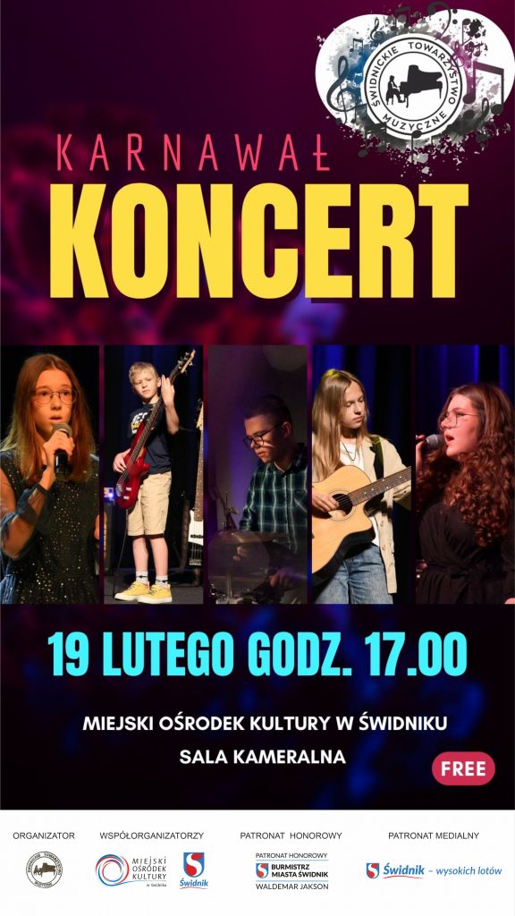 Zapraszamy wszystkich na koncert karnawałowy, który dla mieszkańców Świdnika przygotowali uczniowie Ogniska Muzycznego w Świdniku. Jak przystało na czas karnawałowy repertuar będzie skoczny, taneczny z dużą dawką energii i humoru.