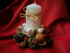 Świeczka ma wtopione druciki, które umocowane są w piance florystycznej. W tejże piance wklejone, bądź wetknięte będą ozdoby.