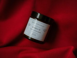 Świeca jest zrobiona z wosku sojowego z dodatkiem olejku zapachowego (cynamon, wanilia, wiśnia).